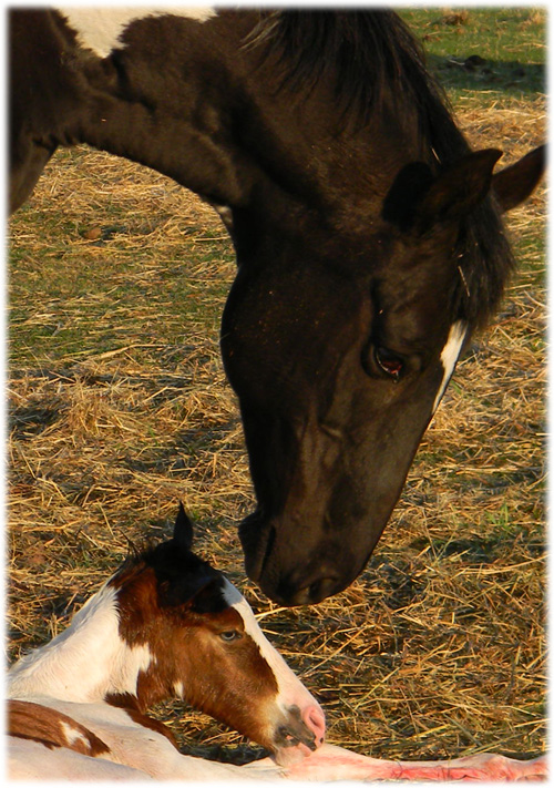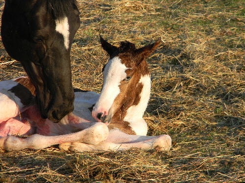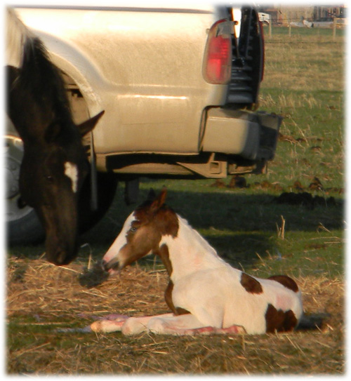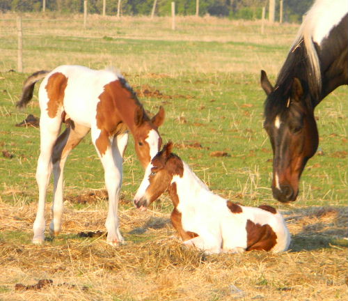 Jazz watching over Magpie's filly, with her colt also